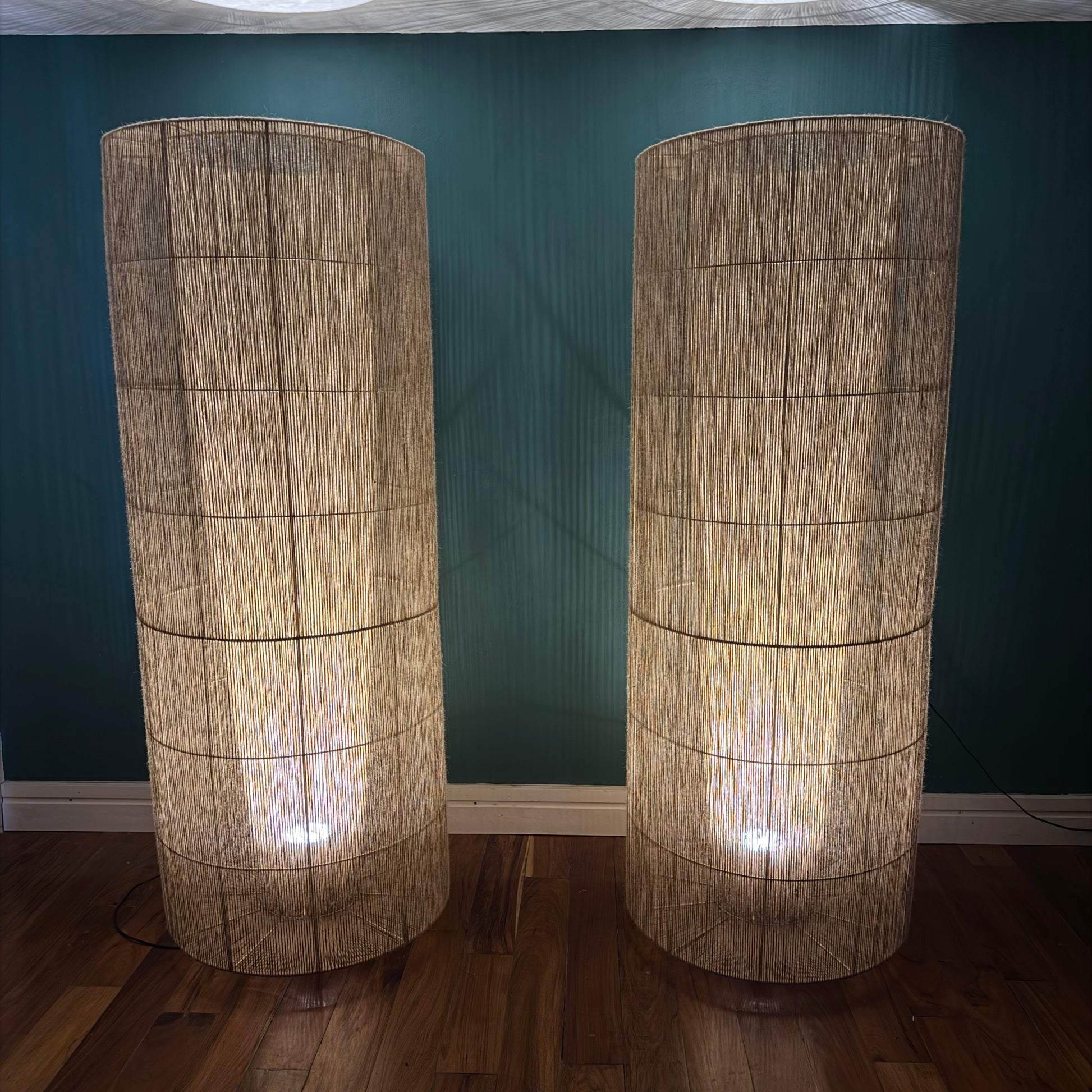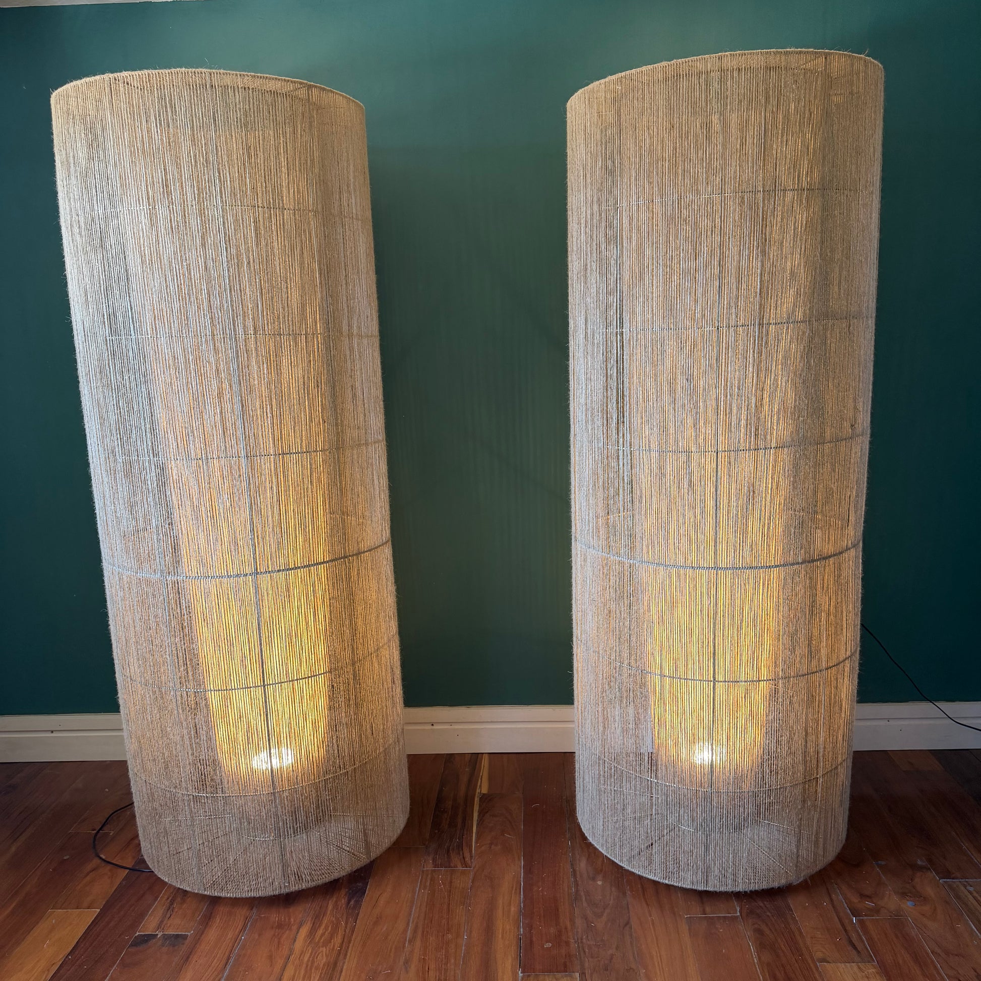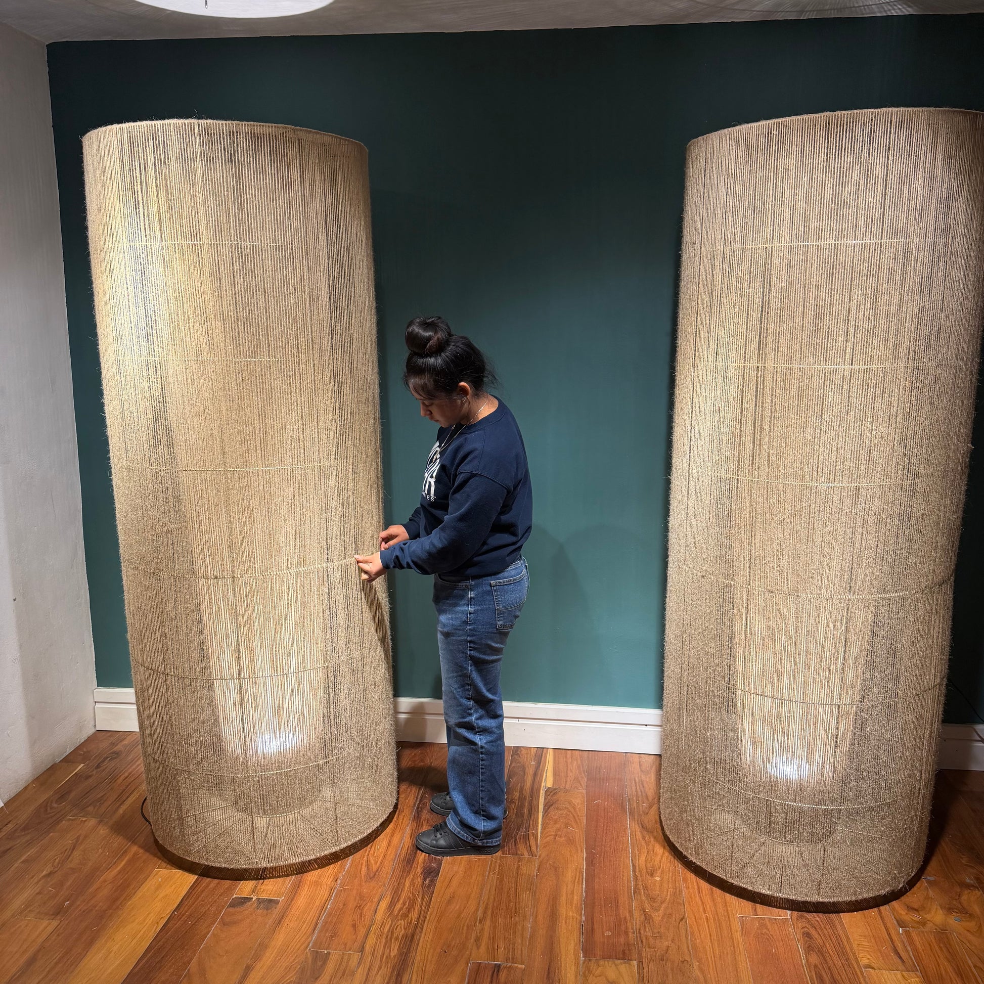 Con una altura imponente de 210 cm y un diámetro de 70 cm, esta lámpara de piso combina presencia y delicadeza en un equilibrio perfecto. Su estructura con acabado electroestático aporta solidez y limpieza visual, mientras que el yute tejido a mano ofrece textura, calidez y un carácter natural que enriquece cualquier ambiente.