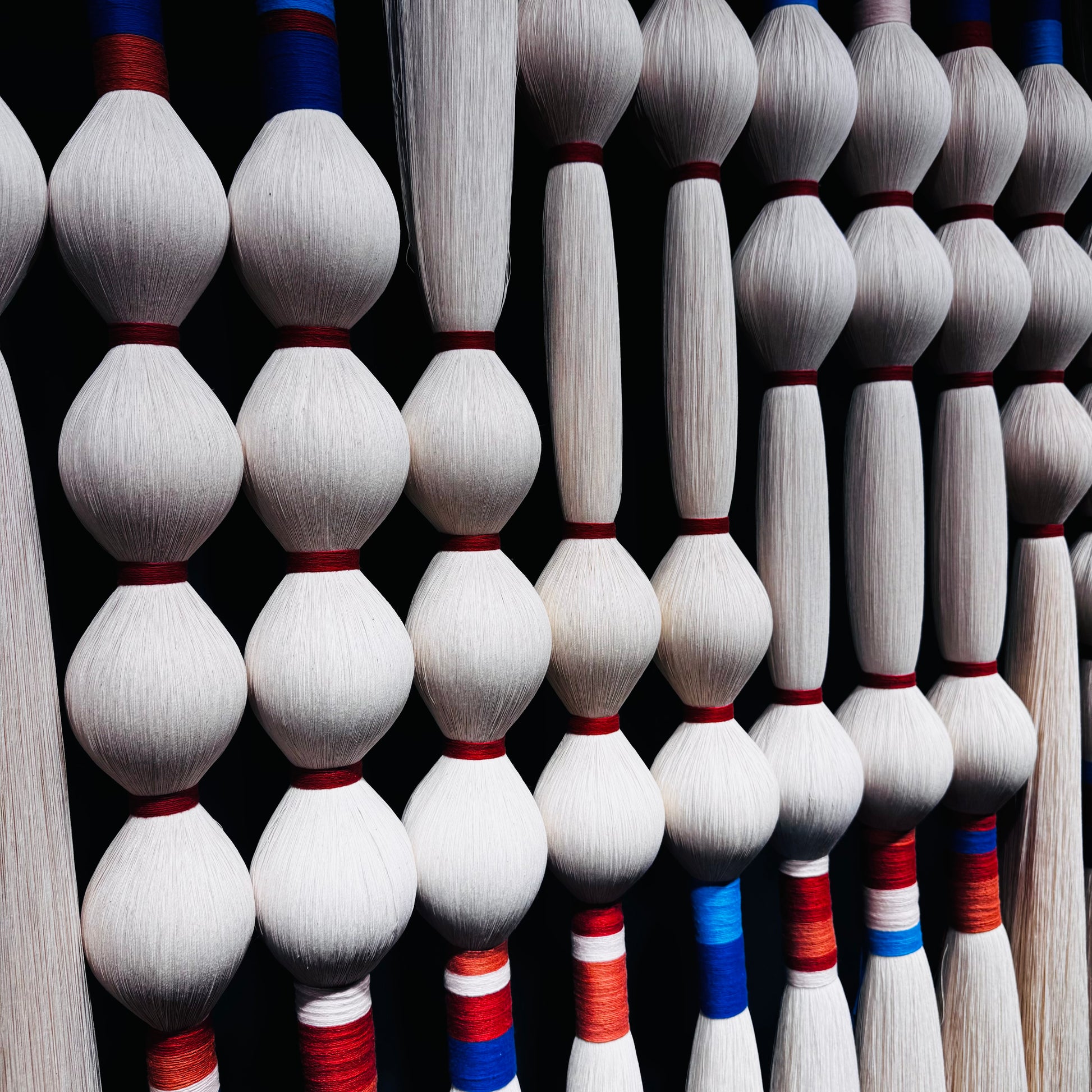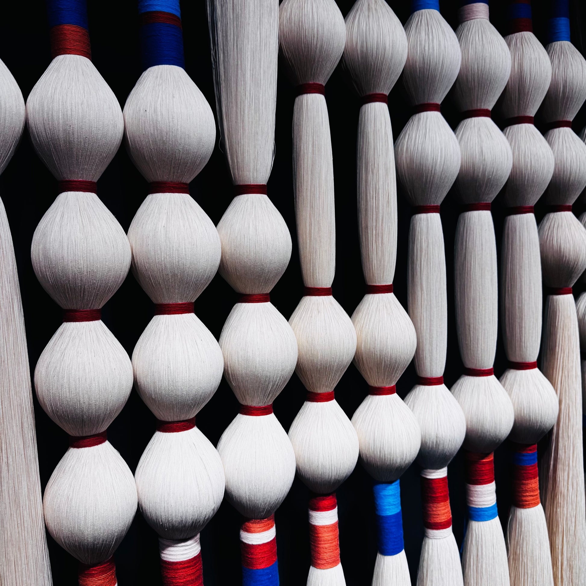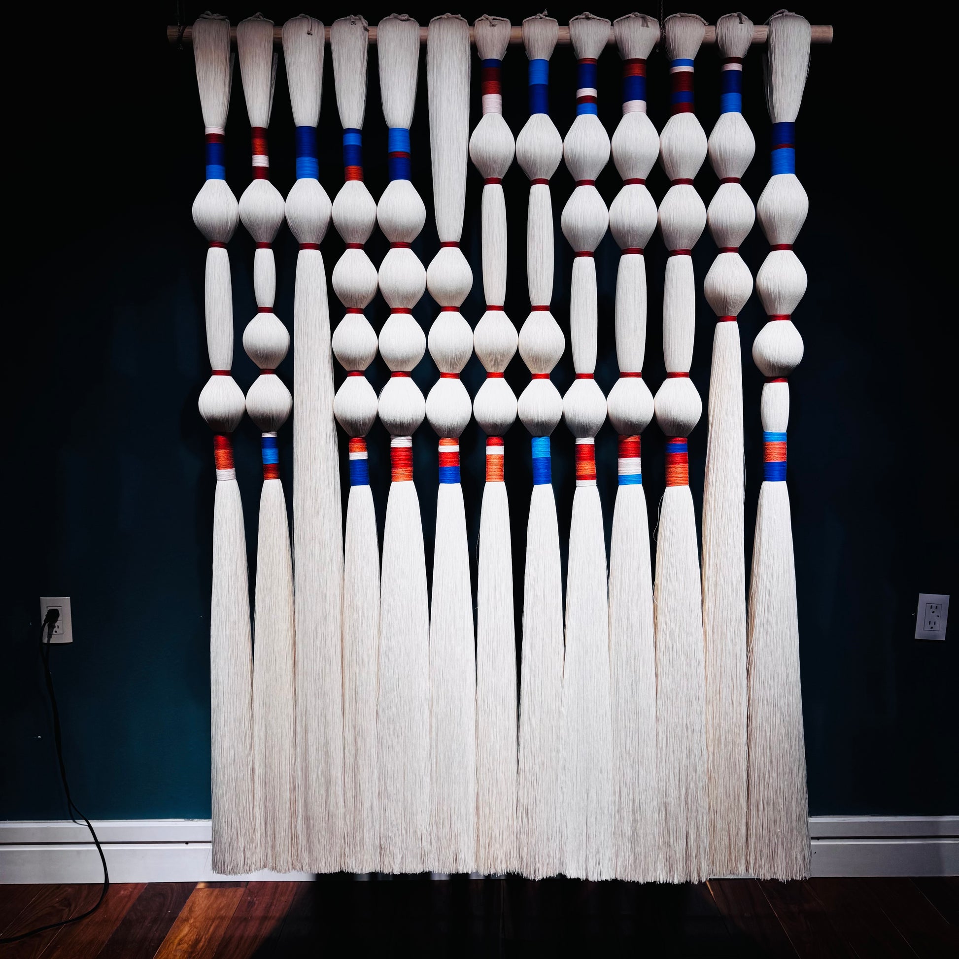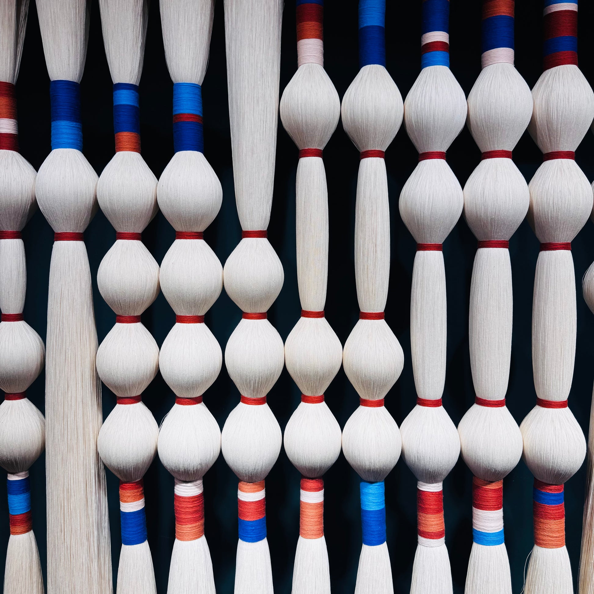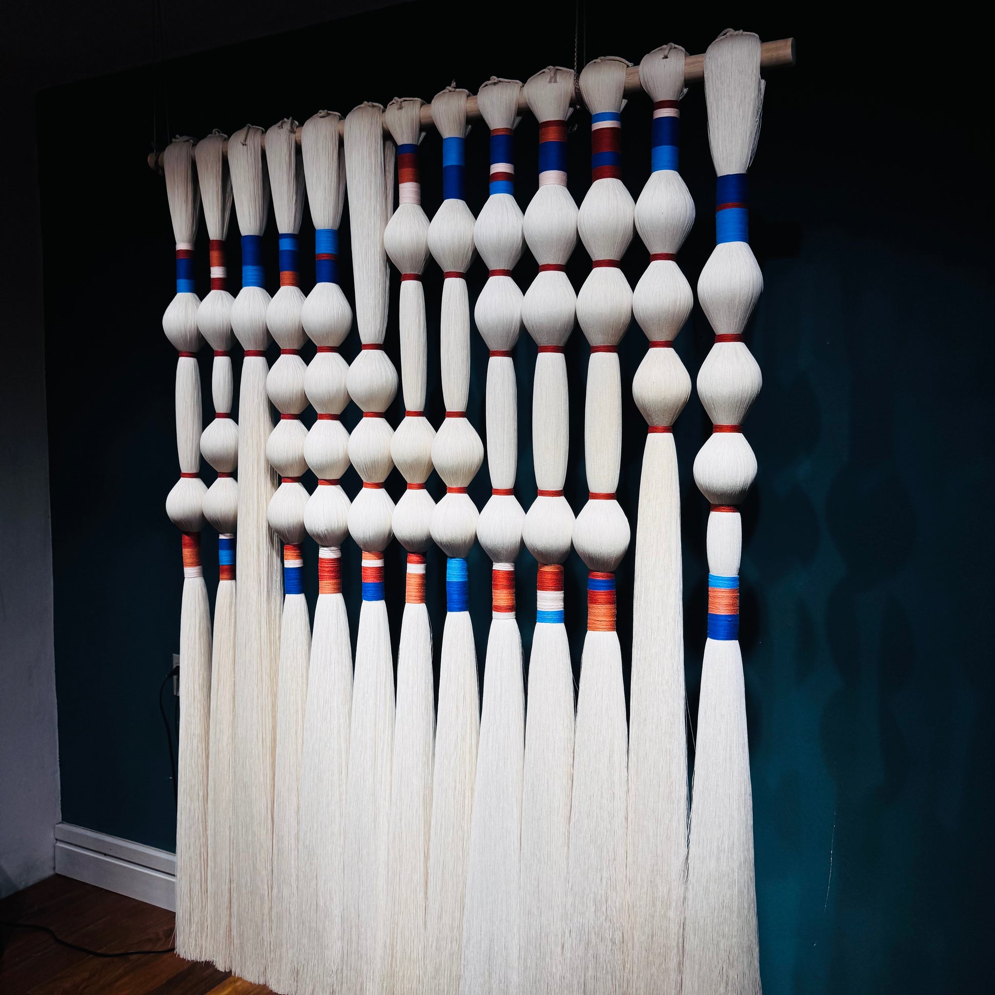 Con 120 cm de largo por 160 cm de alto, 5 Latidos se teje a partir de hilaza almidonada, trabajada con la técnica de embarrilado, una práctica que encierra memoria y paciencia en cada nudo.